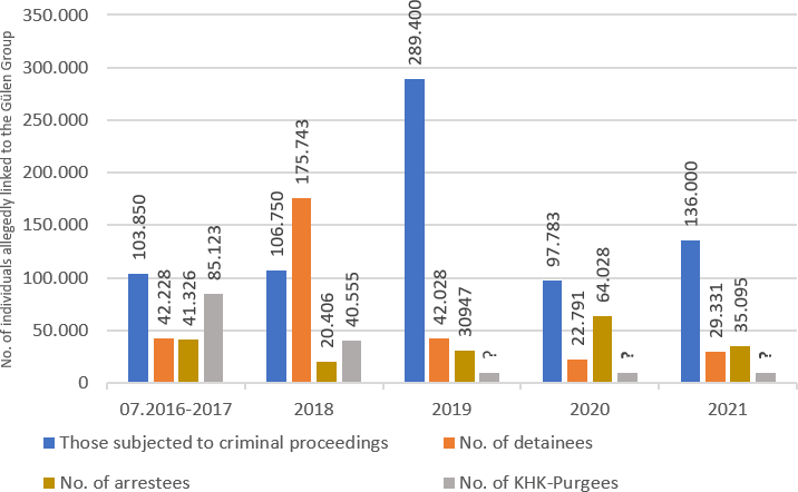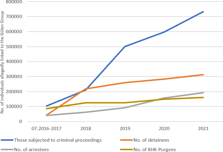 54 Figures in the chart are retrieved from the following sources and subsequently processed: “FETÖ’den kaç kişi tutuklandı? İşte bilanço”, TRT Haber, 03.01.2017, https://www.trthaber.com/haber/gundem/fetoden-kac-kisi- tutuklandi-iste-bilanco-291583.html; „2018’in Terörle Mücadele Bilançosu“, SETA, 17.11.2018, https://www.setav.org/2018in-terorle-mucadele-bilancosu/; 18. ayda FETÖ bilançosu, Hürriyet, 31.01.2018, https://www.hurriyet.com.tr/gundem/18-ayda-feto-bilancosu-kamudan-net-ihrac-107-bin-174-kisi-40727687; “İşte yargıdaki FETÖ bilançosu”, Cumhuriyet, 03.03.2019, https://www.cumhuriyet.com.tr/haber/iste-yargidaki-feto- bilancosu-1276109; “Bakan Soylu, FETÖ bilançosunu açıkladı: 99 bin 66 operasyon”, Sözcü, 15.07.2020, https://www.sozcu.com.tr/2020/gundem/bakan-soylu-feto-bilancosunu-acikladi-99-bin-066-operasyon-5931900/; “Beş yıllık Bilanço”, Diken, 14.07.2021, https://www.diken.com.tr/bes-yillik-bilanco-15-temmuzdan-bugune- fetoye-136-bin-operasyon/; “İşte zulmün korkunç bilançosu!”, TR24, 08.09.2020, https://www.tr724.com/iste-zulmun-korkunc-bilancosu/ (Retrieved 3 August 2021). Number of the purgees after the abolition of the state of emergency cannot be estimated due to the lack of corresponding figures.
